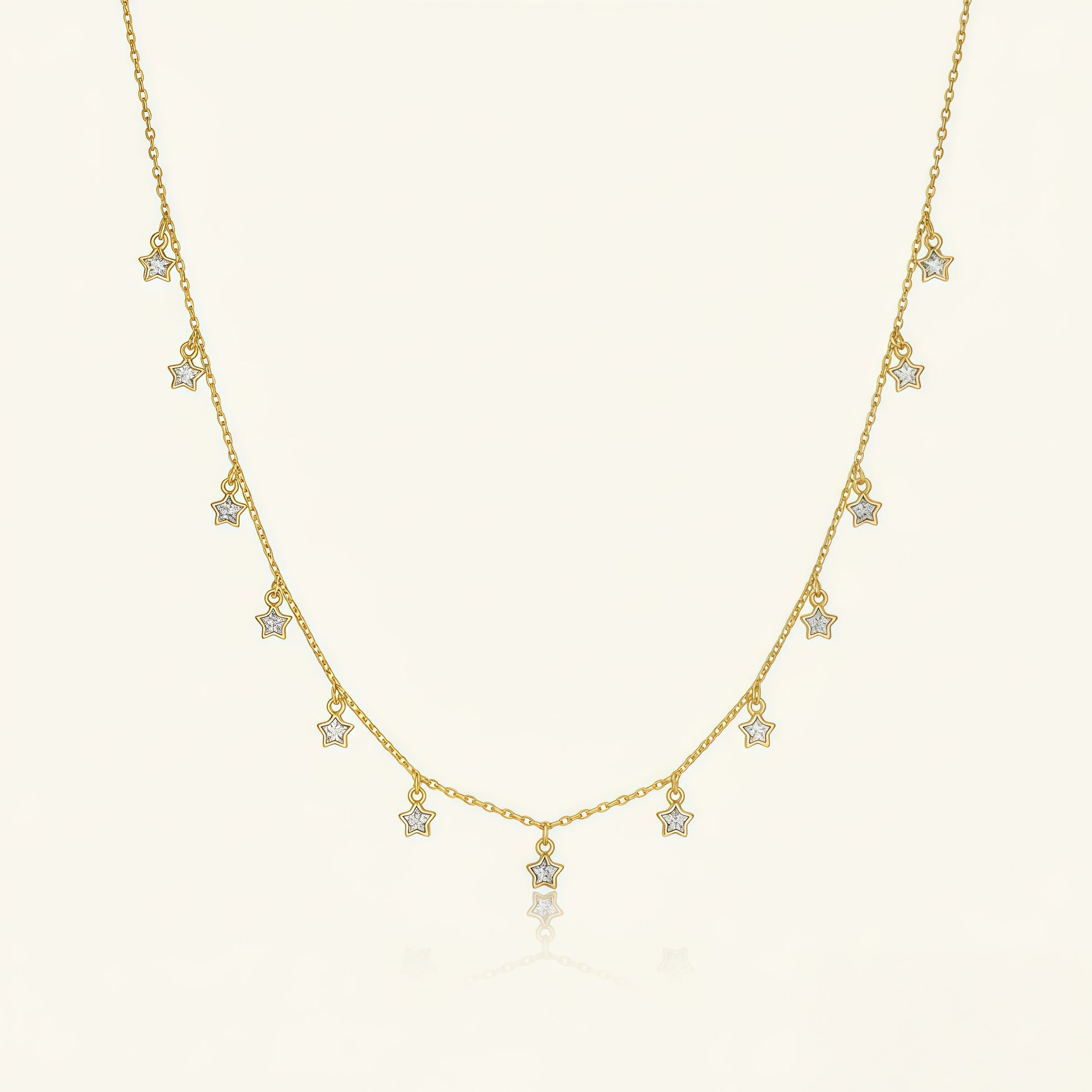 Delicate star motifs shimmer across a fine silver chain, each glinting like a distant star in the quiet sky.